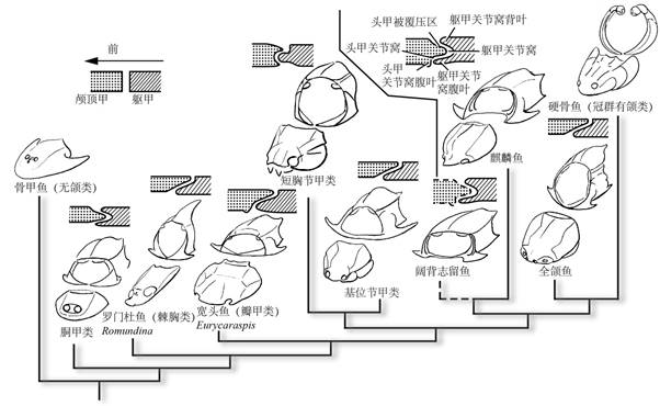 将这些特征置于目前流行的早期有颌脊椎动物演化框架之中,显示外骨骼头颈关节经过了多次平行和反转演化,这暗示随着对其他复杂解剖结构研究的深入,包括头颈关节在内的特征分布可能支持不同的最早期有颌类系统演化假说。