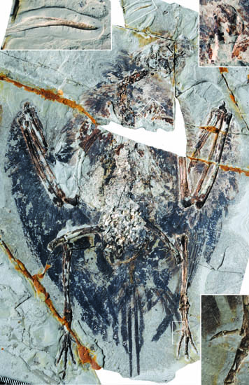 研究人员还发现古喙鸟具有独特的尾羽结构。古喙鸟的尾羽是由12根羽片状羽毛构成的扇状尾羽,位于中间的一对尾羽长度明显超过两侧的其他尾羽,形成一种在现代鸟类中常见的“尖尾”形态,但这样的尾羽形态却未在其他中生代鸟类中有过报道。结合此前的化石发现,越来越多的证据表明现代鸟类所特有的生理结构(如消化系统和呼吸系统)出现的时间很有可能早于骨骼系统的改变。