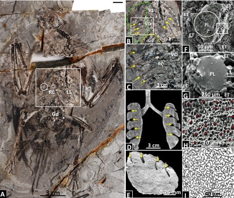 保存肺部结构的是一件发现于早白垩世热河生物群的始吻古喙鸟化石,古喙鸟是目前已知的最原始的今鸟型类代表。研究人员通过扫描电镜在内的多种方法发现了疑似肺部结构的痕迹,详细的形态学研究表明古喙鸟已经具有和现代鸟类极为相似的肺部结构。鸟类的呼吸系统高效而独特,尤其是其肺演化出了一系列特征,例如分块的薄壁系统、分支气囊、肺内单一方向气体流动、肺高度分化从而扩大表面等,均保证了充分的气体交换,从而满足飞行时巨大的有氧代谢需求。已有的化石证据表明单一方向气体流动这一特征在恐龙(包括鸟类)演化历史中出现较早,但是能够进一步揭示肺的结构的化石还从未在主龙类化石中有过发现。主龙类是包括鳄鱼、翼龙和恐龙(包括鸟类)等在内的一类双弓类羊膜动物。古喙鸟的肺部结构显示了和现代鸟类相似的高度分化,表明与飞行相适应的高度气体交换能力在鸟类演化早期就已经出现。