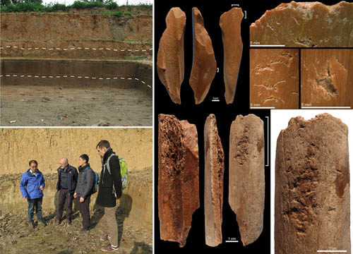 图1:左上展示许昌人遗址发掘场景;左下是研究者于2016年冬考察许昌人遗址照片(从左至右:李占扬,Francesco d’Errico,李浩,Luc Doyon);右侧展示2件发现于许昌人遗址的骨质软锤工具,其中右上的1件采用新鲜动物长骨,疤痕稀疏,使用程度低;右下的1件采用风化动物长骨,疤痕集中,使用程度高(Luc Doyon供图)