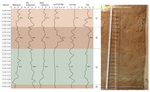 图3:遗址沉积物粒度(从左至右为平均粒径、粉砂、砂)、磁化率、Fe3+/ Fe2+及CIA指标随深度变化情况,曲线旁数字代表每一沉积阶段该指标的平均值(李浩供图)