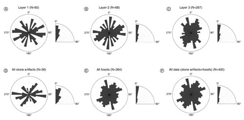 图4:遗址出土遗物的产状信息玫瑰图,圆形指示长轴方向,1/4圆指示倾角(李浩供图)