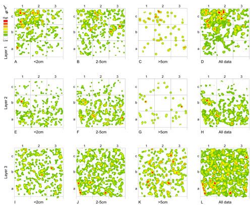图5:遗址不同沉积阶段遗物的空间密度分布图(李浩供图)