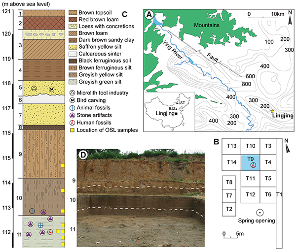 图1:河南灵井许昌人遗址地理位置、布方、发掘和地层图(李浩供图)