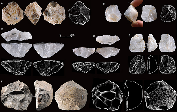 图2:许昌人遗址出土石核:a,b盘状石核;c,d单台面石核;e,f具有部分勒瓦娄哇技术特点的石核(李浩供图)