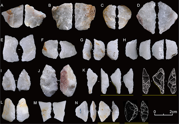 图3:许昌人遗址出土石器:a,b刮削器;c,d锯齿刃器;e,f凹缺器;g,h石钻;i,j,k尖状器;l,m卵石毛坯的工具;n修背工具。k中黄色虚线指示尖状器底部的修理(李浩供图)