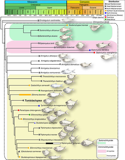 本研究依据新的系统发育关系,梳理了埃笠姆鲱的动物地理学历史,并对其多样性发展过程提出新的解释。我们认为晚白垩世赛诺曼期埃笠姆鲱在西特提斯洋区(今天的地中海)多样性达到顶峰,可能与当时高海平面和广泛海侵有关。当西特提斯洋由纵贯非洲大陆北部的地表海与大西洋热带区域联通,栖息地扩大、暖流的注入、食物输入增加,促进了它们种群的迁移和扩散,并导致异域成种作用增强。白垩纪之后这一类群逐渐衰亡,目前其最年轻的记录来自渐新世的广西宁明。