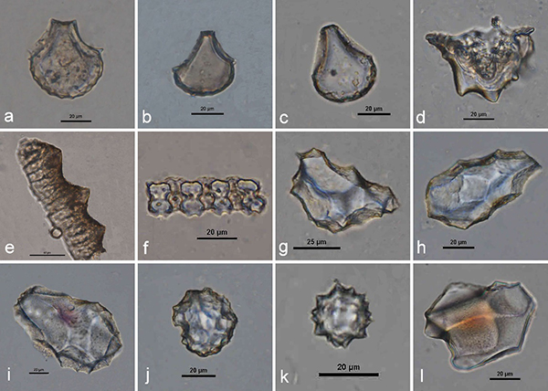 1 茶岭遗址常见植硅体类型(a-f:水稻植硅体)