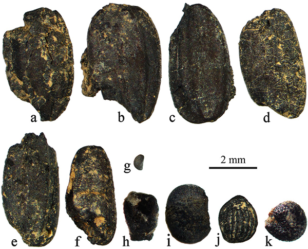 2 茶岭遗址若干单位出土的炭化植物遗存(a-f:水稻)