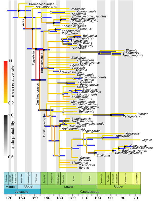 1:中生代鸟类的系统发育关系、分化时间和演化速率(张驰供图)