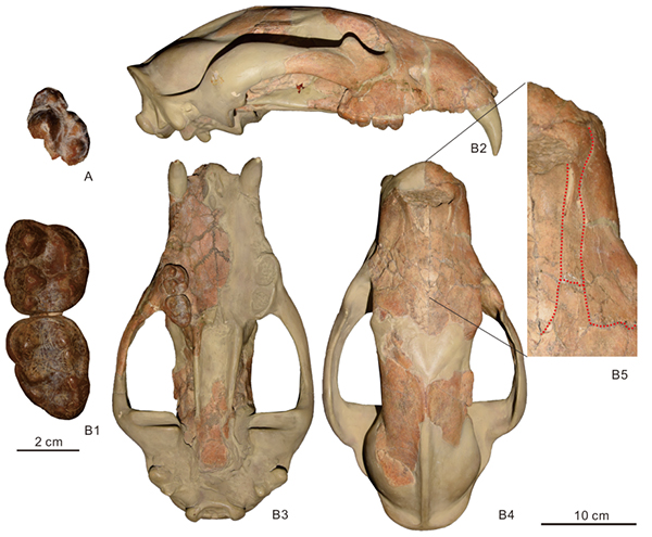 近日,中科院古脊椎所博士研究生江左其杲和美国自然历史博物馆余琮煜,John Flynn合作,在国际古生物学期刊《历史生物学》(Historical Biology)上详细报道了来自耶鲁大学Peabody博物馆馆藏的南亚印度熊及其他犬形亚目的化石。该批化石系Lewis在1933年采集,但多数都没有经过详细描述或报道。这批化石中保存最好的是一件产自Dhok Pathan Zone的印度熊头骨化石。印度熊(Indarctos)是熊科大熊猫亚科成员,出现并繁盛于晚中新世(11.3-5.3 Ma)。和现代佛系的大熊猫不同,印度熊并非以竹子为主食,而和现代棕熊一样是杂食动物,并且拥有捕食大型猎物的能力。印度熊最早即发现在南亚( 包括2种,即盐岭印度熊Indarctos salmontanus和旁遮普印度熊Indarctos punjabiensis),故而得名印度熊。然而南亚最初发现的印度熊化石保存较为残破,因此学术界对于南亚印度熊的性质,存在诸多争议。通过对新的头骨材料的研究,研究人员发现印度熊模式种,盐岭印度熊Indarctos salmontanus和欧洲的阿提卡印度熊(Indarctos atticus)差别非常小,其中少量的差别,如体型稍大,M2具有后附尖,更可能代表同一个物种的地理变异,因此学者将盐岭印度熊归入阿提卡印度熊。南亚的另外一种印度熊,旁遮普印度熊(Indarctos punjabiensis)则具有明显的特殊性,该种P4次尖不明显双分,M2跟座非常短,M2长度接近M1,这些特征与任何印度熊都不同,反而接近郊熊(Agriotherium)。综合对比认为旁遮普印度熊最接近北美的舒氏“郊熊” (“Agriotherium” schneideri),二者的特征都介于典型的印度熊和郊熊之间,可能属于一个新属。综合来看,印度熊的模式种应该修订为阿提卡印度熊(Indarctos atticus),而旁遮普印度熊不能归入印度熊。