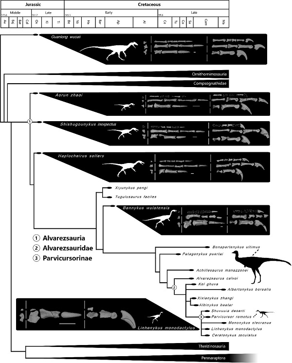 图.2 在系统演化树上呈现的阿尔瓦雷斯龙类前肢演化和体型演化历程(秦子川供图)