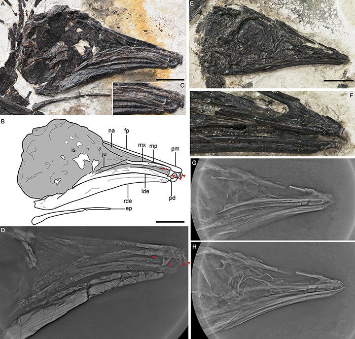 图2 有齿孟子鸟和李氏叉尾鸟头骨比较(王敏供图)