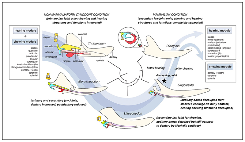 图五. 哺乳动物(兽类)听觉和咀嚼形态功能模块式演化分离示意图 (毛方园 供图)