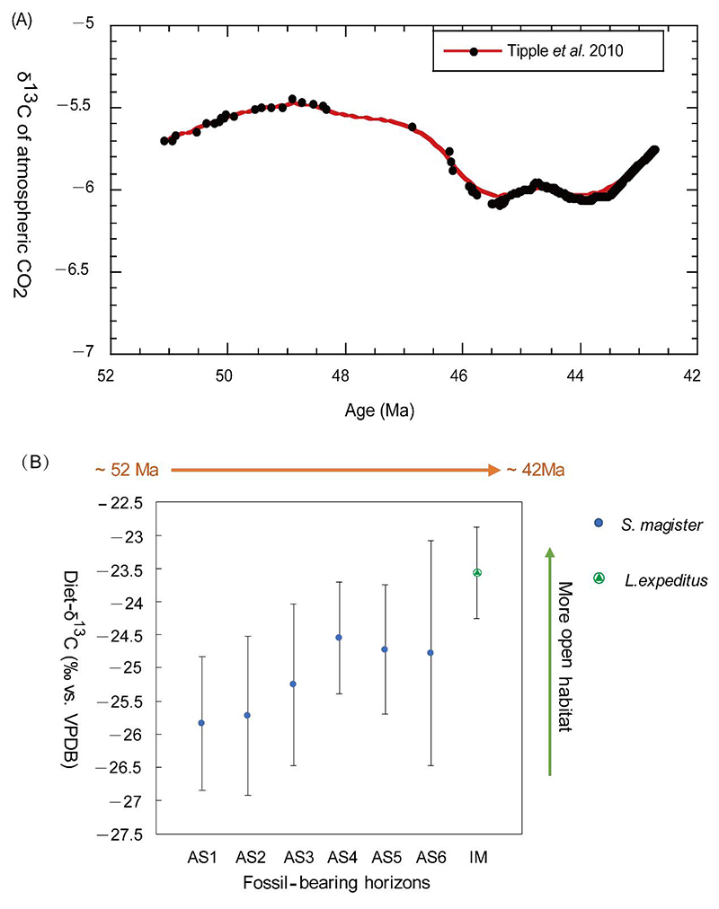 3 A:-中始新世大气二氧化碳δ13C值的变化; B:阿山头组与伊尔丁曼哈组不同化石层位中施氏貘与脊齿貘的平均饮食δ13C值及其分布