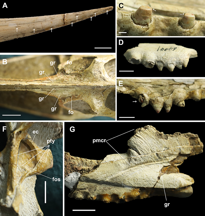 图3. 魏氏准噶尔翼龙上下颌细长尖锐上翘无齿的吻部及附着角质外套的沟状印痕