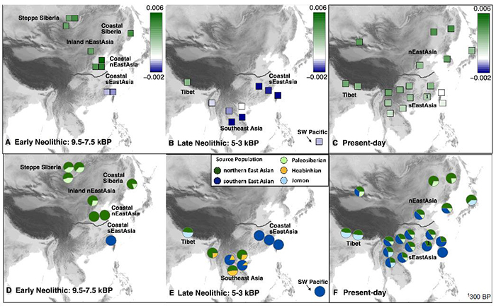 研究所涉及新石器时代早期人群样本,包括来自北方山东、内蒙古地区5个遗址(扁扁洞、小荆山、小高遗址、博山遗址、裕民遗址)距今9,500-7,700年的7个个体,及南方福建、台湾海峡2个遗址(奇和洞、亮岛)距今8,400-7,600年的3个个体。通过研究这些人群的基因组发现,在沿着黄河流域直到西伯利亚东部草原的人群,至少从9,500年前起都携有一种以新石器时代山东个体(图3)为代表的古北方人群成分而中国大陆沿海及台湾海峡岛屿人群至少从8400年前起就携有一种以新石器时代福建及其毗邻岛屿个体为代表的古南方人群成分(图1C和D),且这两种成分截然不同(图3A)。然而随着时间的推移,东亚大陆南北方人群之间的这种差异性和分化程度逐渐缩小(图4A),这种变化暗示着自新石器时代以来南北方之间频繁的人群迁移与混合。此外,在8,300-7,700年山东人群中发现古南方人群联系(图2B)及在约8,300亮岛1号人发现有少量古北方人群的影响(图2D),反映南北方人群已经开始互动。
