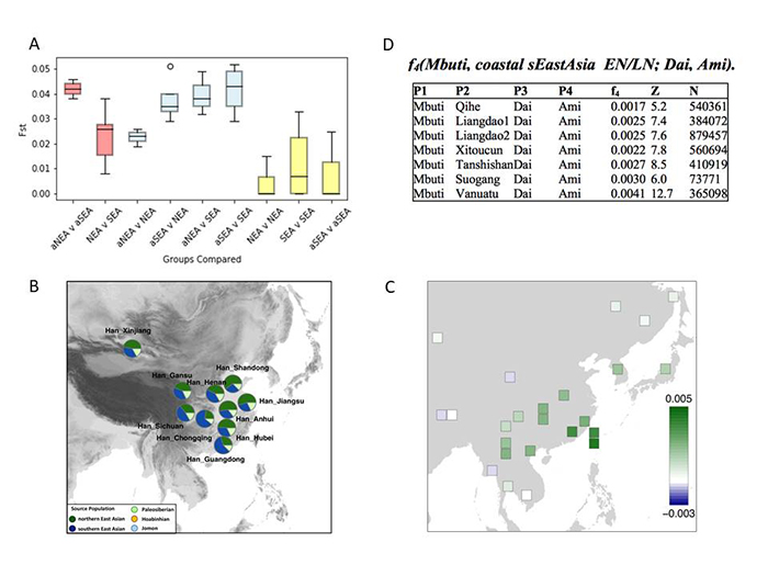 图4:(A)不同人群的遗传分化指数分布图,指数越高表示相关人群的分化程度越高,遗传差异越大,该图表明新石器时代南北方人群的的遗传差异远高于现今东亚南北方人群。(B)现代汉族人群祖源成分与地理分布图。现今中国南北方的汉族人群,不管是在南方还是北方,均显示混合有东亚古南方人群成分、古北方人群成分、古西伯利亚人成分。其中,现代汉族人群里携有古北方人群成分比例最高的群体显示位于山东,这里也正是本研究古北方人群的代表个体样本的遗址所在地,由此反映出山东地区人群自新石器时代以来的遗传连续性。(C)现今东亚人群与古南方人群、北方达斡尔族人群的遗传关系图,绿色表示与古南方人群的关系更近,蓝色表示与达斡尔族人群更近。(D)古南方人群与现今傣族人群、台湾岛阿美族人群的遗传关系的f4分析图,Z>3 表示与阿美族人群关系更近。