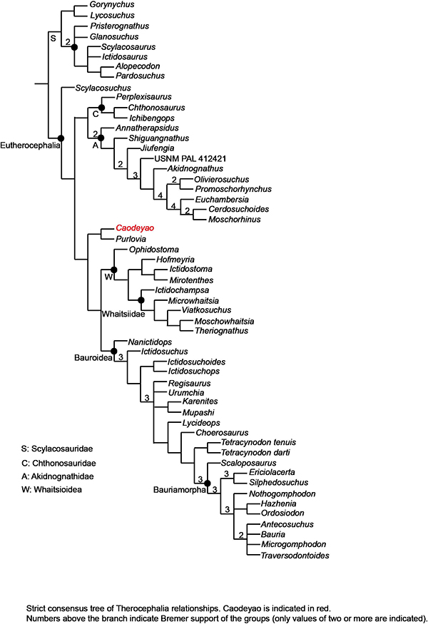 本次研究报道的刘氏曹德尧兽具有吻部短高,颞孔宽,下颌的冠状突远离颧弓等特征。后一特征在二叠纪兽头类中仅见于俄罗斯的Purlovia maxima,支序分析表明曹德尧兽与俄罗斯的Purlovia代表了一个目前仅发现在劳亚大陆的支系,表明中国二叠纪晚期的兽头类具有较高的多样性。