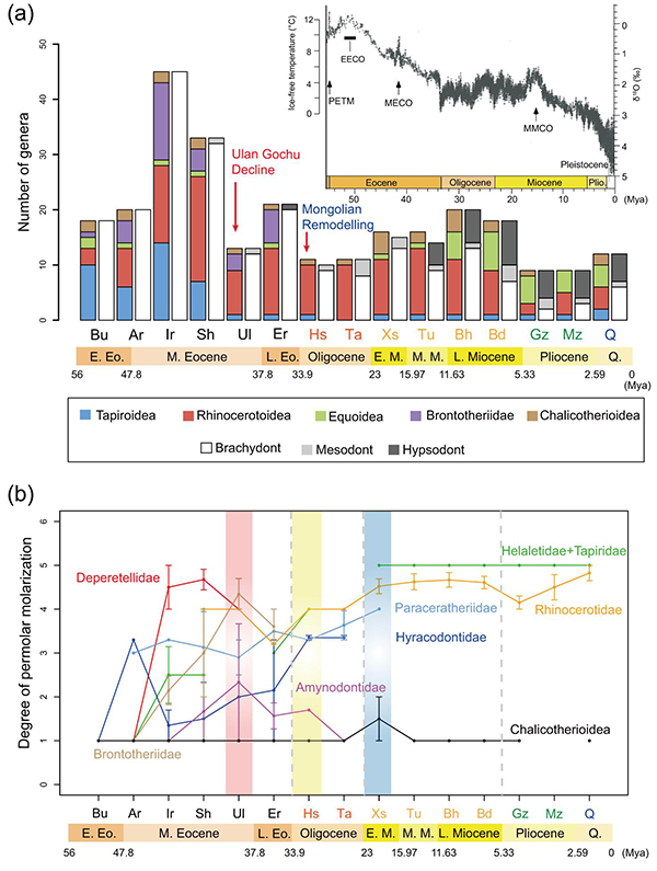 图.亚洲新生代奇蹄类多样性的变化和奇蹄类不同支系前臼齿臼齿化的程度(白滨 供图)
