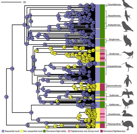 图1.鸟类换羽行为的演化历程。紫色:顺序换羽;黄色:非顺序换羽;绿色:稳定的飞行能力;粉色:换羽期间失去飞行能力;品红:完全失去飞行能力