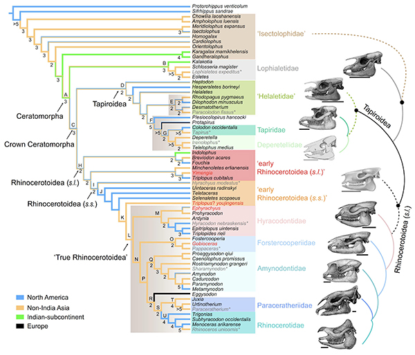 大约5000万年前的早始新世,北美和亚洲出现了最早的貘超科成员Heptodon,之后出现的貘犀Hyrachyus被认为是从貘到犀的过渡类群,在经过约400万年演化之后,才出现了没有争议的犀超科化石。但Hyrachyus自身的分类和演化就十分复杂,该类群是否是所有犀超科化石的祖先类群也存有争议。所以有关犀超科的起源一直众说纷纭,而仅仅涉及貘超科或犀超科的系统发育分析,也无法对整个角形类的演化有全面认识。
