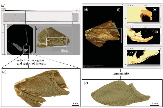 该研究以一组澳大利亚早泥盆世盾皮鱼化石的CT扫描数据为例,首次详细介绍了三维成像数据处理软件Drishti最新版本中的执行数据重建分割Drishti Paint 模块,Drishti软件三个模块之间的关系和交互,以及体积探索,体渲染的应用功能等内容。文中着重介绍了一种用于对体积数据进行阈值处理(即梯度阈值处理)的新工具,以及一种使用3D Freeform Painter工具执行三维分割的新方法。这些新工具和工作流程可以实现更准确,更精确的重建,建模和3D打印。该研究为CT数据的分割和重建提供了新的工具和思路,对于精准分割体数据,优化三维重建,三维模型制作、渲染和3D打印效果具有重要意义。
