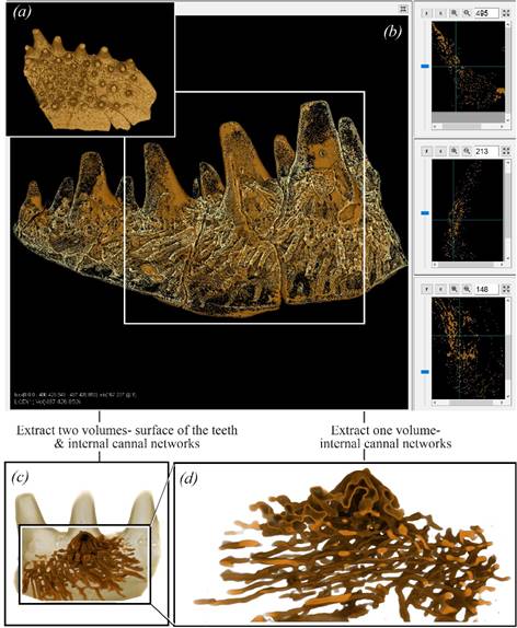图2. 使用Drishti Paint对澳大利亚早泥盆世盾皮鱼颌骨脉管结构进行三维重建