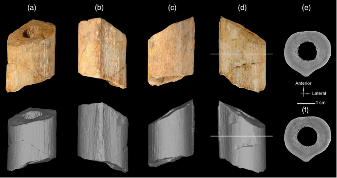 在华龙洞发现的人类化石中,包括三件股骨。作为华龙洞人类化石系列研究之一,研究人员对该地点出土的3件股骨(编号为HLD111516)形态进行了详细描述和对比。除传统的骨骼形态观测外,本研究还使用micro-CT扫描华龙洞股骨材料,获得特定位置的断面(80%50%),并计算了一系列生物力学参数,包括骨密质所占断面面积百分比(反映的是股骨轴向抗压力和张力的刚度)和截面惯性矩(反映的是股骨抗弯刚度)。