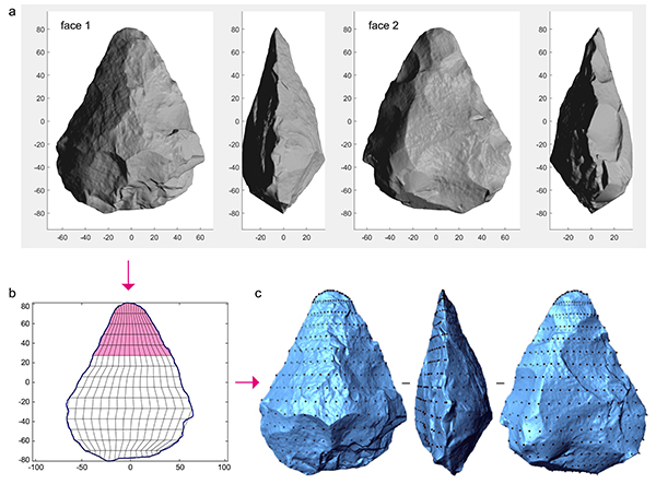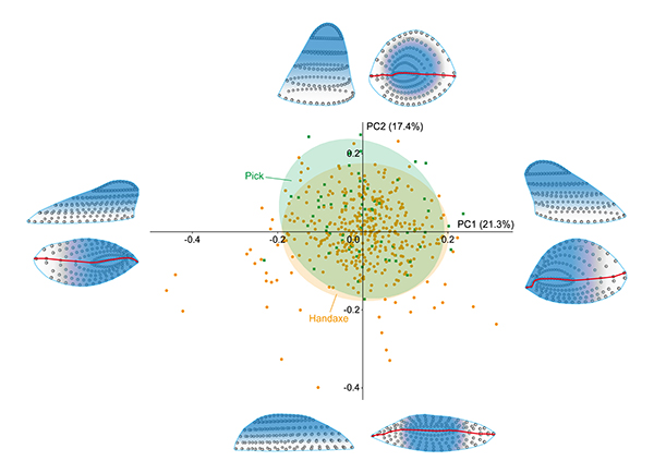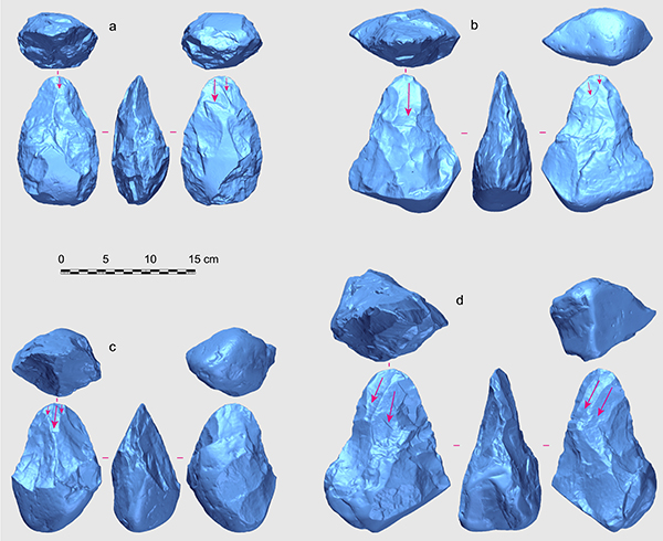 近日,《考古科学杂志:报道》(Journal of Archaeological Science: Reports)在线发表了中国科学院古脊椎动物与古人类研究所李浩副研究员、贵州大学雷蕾博士和广西民族大学李大伟副教授等合作完成的研究成果。通过利用R语言中的Geomorph程序包和AGMT3-D(Artifact GeoMorph Toolbox 3D,即人工制品三维几何形态工具箱)等软件,研究团队对广西百色盆地发现的手斧等大型工具进行了详细的三维几何形态特征分析(图1),进而探讨了百色盆地手斧和手镐工具(阿舍利大型工具中的两种主要类型)的类型划分、工具形态与加工技术之间的关联,以及早-中更新世之交中国古人类的技术与认知能力发展等问题。