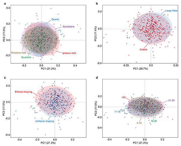 图4 百色盆地大型工具远端形态的分组(a:不同原料; b:不同毛坯; c:不同修型模式; d:不同修型程度)主成分分析结果,椭圆代表95%置信区间