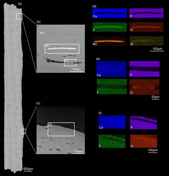 (a)骨组织学切片背散射模式下电镜照片;(b, d)脉管道内填充晶体,其锰氟氧含量高,基本没有钙磷,应是锰质胶结物;(c, e, f)脉管道内填充晶体,钙氧含量高,基本不含磷,氟含量下降,应是方解石