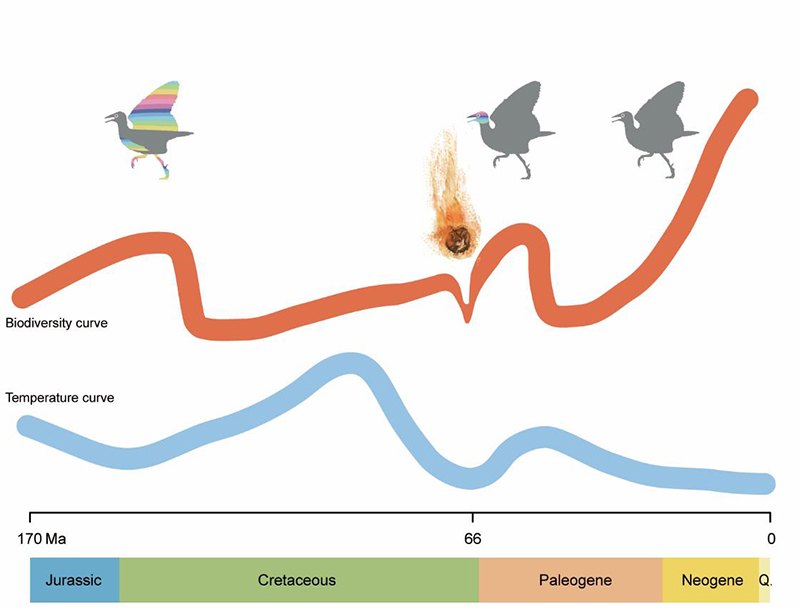 图1 鸟类生物多样性演化和气候及白垩纪末大灭绝事件的关系示意图(任名卉绘)