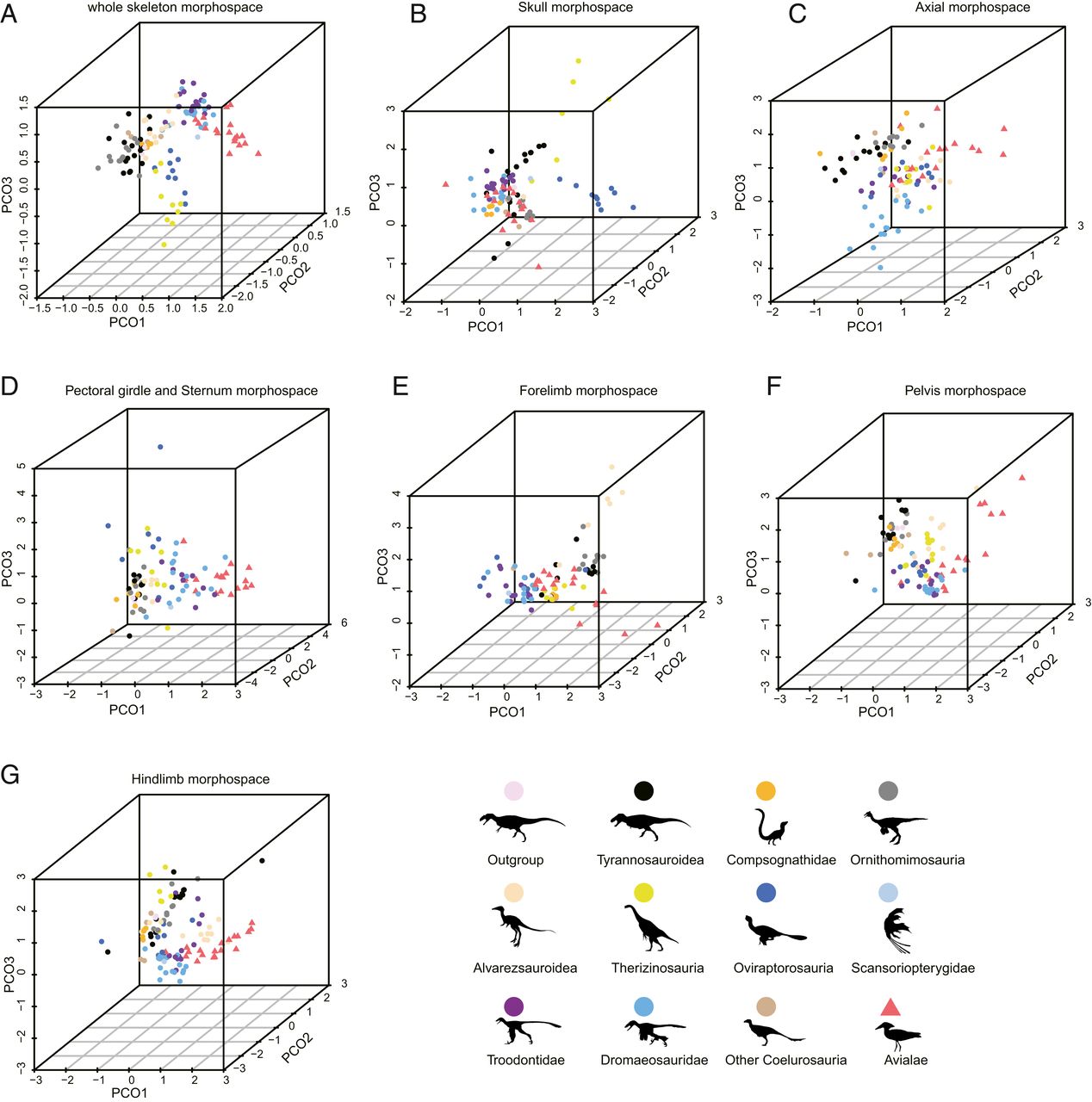 图 2 鸟类和恐龙形态差异度分析显示早期鸟类明显不同于其恐龙近亲