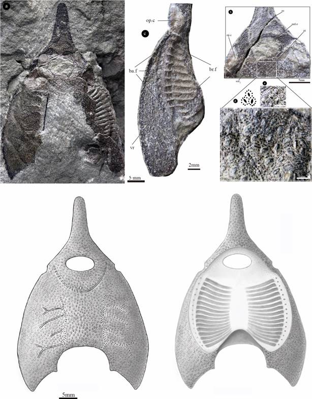 1 橄榄纹曲师鱼头甲化石照片及其复原图(郭肖聪绘)