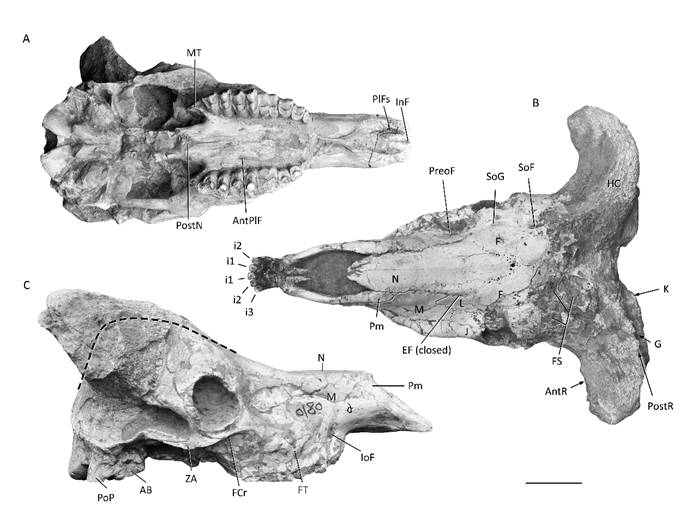 图1 和政羊头骨腹视、背视和侧视图。(史勤勤供图)