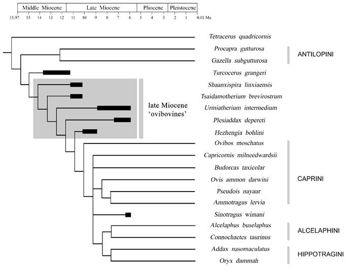 此外,研究人员还对和政羊的系统发育关系进行探讨,并对中国晚中新世“麝牛类”牛科动物的系统发育关系进行了系统的梳理。这是一类头骨和角心都很特化的牛科动物,其系统发育关系极具争议。尤其是近年来,分子生物学的发展为现生牛科动物的演化关系带来了很多新的观点,特别是现生麝牛(Ovibos)不再与羚牛(Budorcas)构成姐妹群,而是与鬣羚(Capricornis)、斑羚(Naemorhedus)组成一个单系类群,位于羊族(Caprini)的基干位置,与传统的基于形态的分类学观点差别较大。在这样的背景之下,中国晚中新世“麝牛类”牛科动物的与现生麝牛的关系,以及它们在整个牛科动物演化关系中的位置都亟待讨论。在该研究中,研究人员选取了110个头骨、牙齿及角心的形态学性状,建立了包含7种化石牛科动物、13种现生牛科动物的形态学矩阵,使用分支系统学的方法进行分析。结果表明,晚中新世“麝牛类”与中中新世土耳其羚(Turcocerus)、现生羊族、狷羚族、马羚族都位于同一支系上,但是相比现生种类,它们都是该支系上较早的分支,是灭绝了的早期类型,与现生麝牛的类亲源关系较远。只有中华羚(Sinotragus)位于现生羊族、狷羚族和马羚族组成的冠群之中,是一种更加进步的牛科动物。