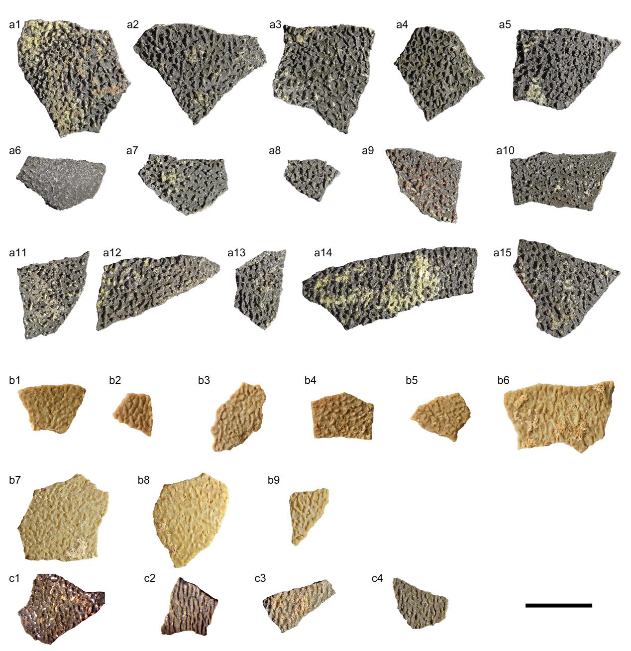 图1. 坪岭叠层蛋蛋壳碎片,a,b,c分别代表南雄、山阳、莱阳的材料(标尺为1 cm)