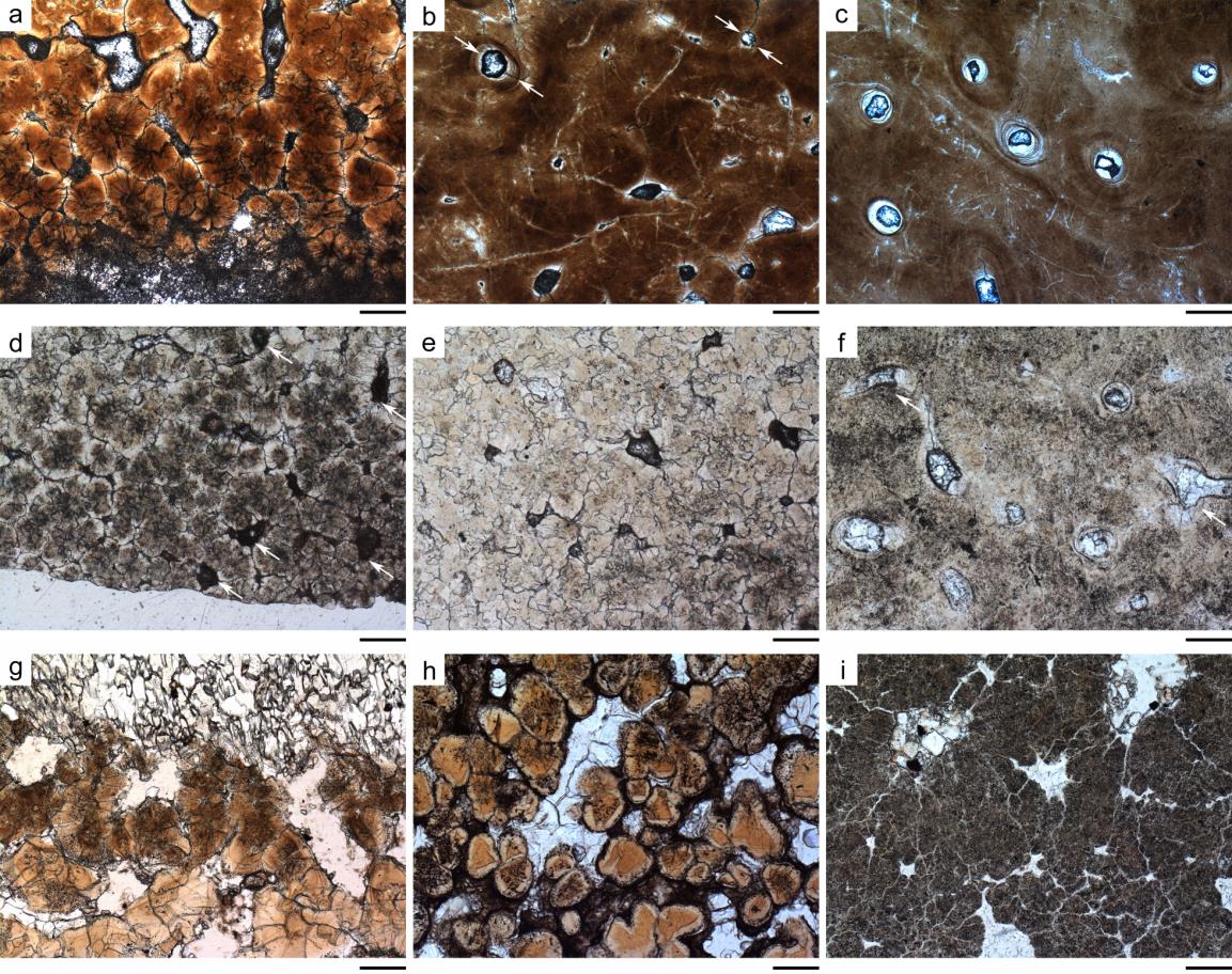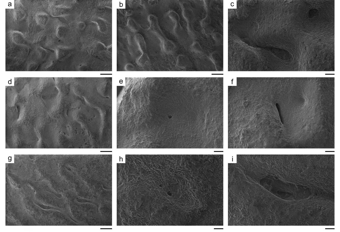 图2. 坪岭叠层蛋蛋壳纹饰及气孔开口特征,上、中、下分别为南雄、山阳、莱阳的材料(a,b,d,g标尺为500 μm,c,e,f,h,i标尺为100 μm)