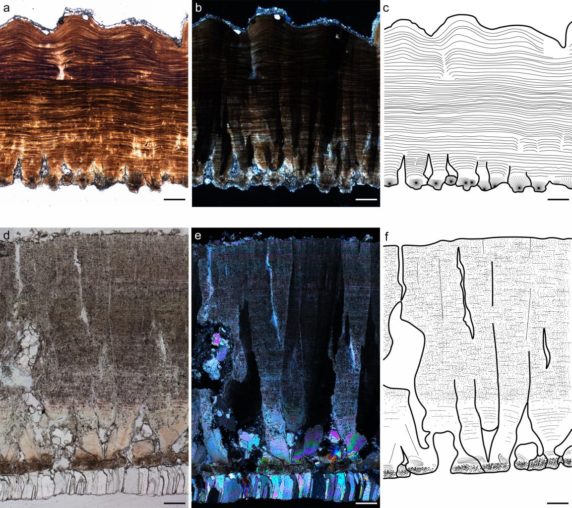 图3. 坪岭叠层蛋(上)与将军顶圆形蛋(下)蛋壳径切面显微结构对比,从左至右依次为普通透射光照片,正交偏光照片,结构素描图 (标尺为200 μm)