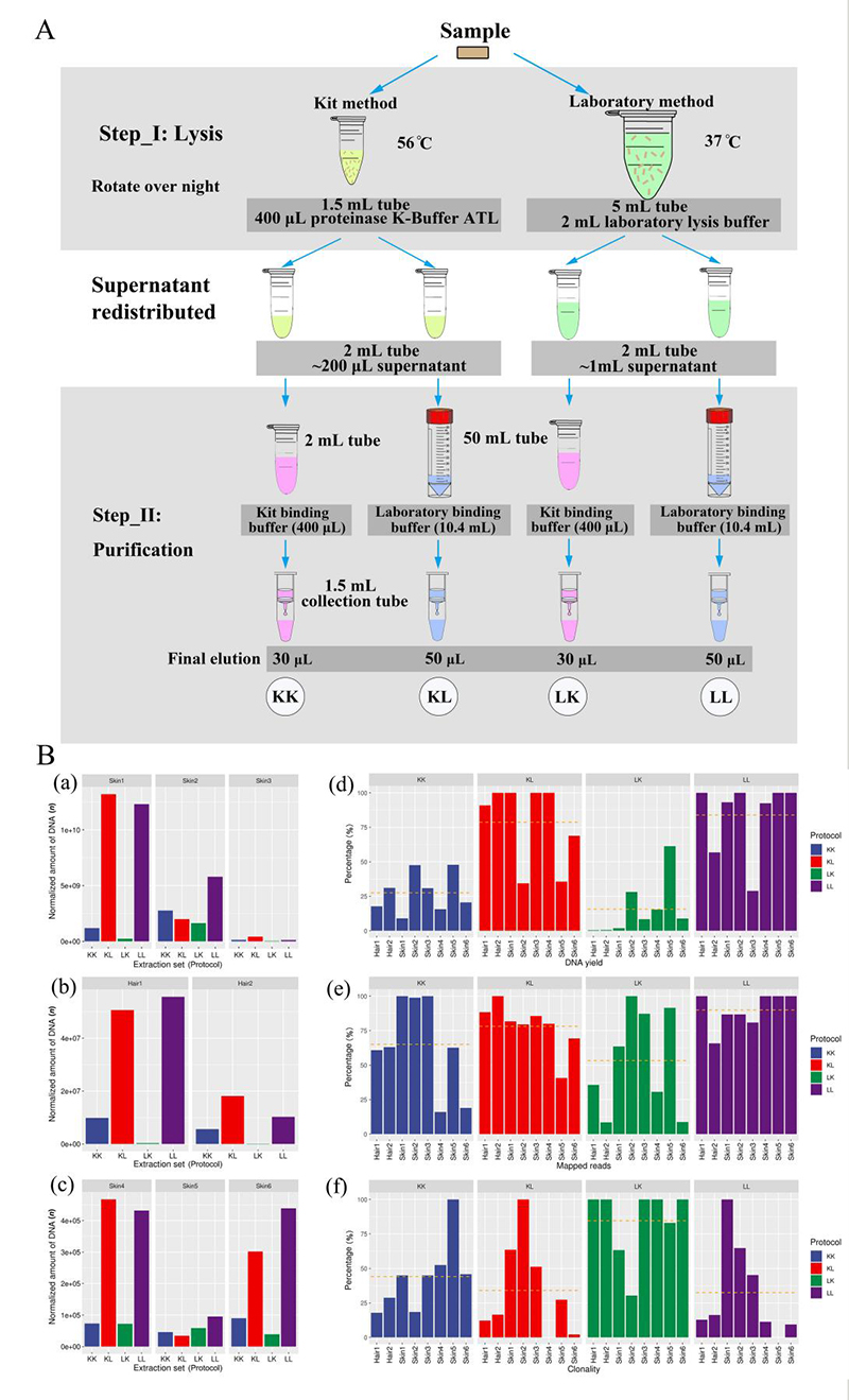 本研究比较4种提取方法对陈旧皮张DNA提取的有效性,研究比较了所有方法获得的DNA产量和内源短序列数、短序列复杂度、短序列末端损伤、短序列平均长度。结果发现,虽然4种方法均能够有效获取内源DNA片段,但相比于其他方法,改良的古DNA实验室方法能够获得更多和更好质量的DNA信息。改良的古DNA实验室方法在获取陈旧皮张DNA方面有一定优势。另外,本研究发现影响提取效果的原因主要是第二步纯化。所以研究认为。这种方法值得在博物馆保存的陈旧皮张样品的DNA提取方面进行推广应用。