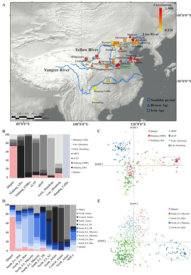 河南荥阳青台遗址出土的彩陶等器物进行分析表明该遗址具有典型的仰韶文化特征。本研究从该遗址获取了60例古代个体的线粒体全基因组,单倍群识别结果显示青台人群具有高度多样性的线粒体单倍型,许多单倍型在现代汉族人群中仍然保留。研究者进一步将青台人群线粒体基因组与之前发表的超过五千例古今个体的线粒体基因组进行比对分析。结果表明,青台人群与现代汉族人群存在母系遗传联系,可能对现代汉族人群的母系遗传多样性做出了一定的遗传贡献。此外,青台人群与距今4600年后的山东龙山文化人群的母系遗传联系很显著,为仰韶文化与龙山文化之间紧密的考古学联系找到了人群之间存在紧密遗传学关系的依据。