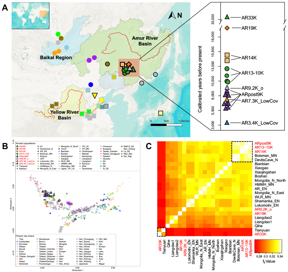 末次盛冰期之后,东亚北部人群的流动情况又是如何?本研究通过获取末次盛冰期之后黑龙江地区的16例个体基因组数据(距今约1.4-0.9万年),发现黑龙江流域人群的遗传连续性可能早在1.4万年前就已经开始,这比此前假说所提出的时间向前推进了6000年。该结论与黑龙江地区陶器和玉器最早出现在1.5万年前的考古记录相符。另外,本研究发现生活在末次盛冰期后、距今1.4万年前的AR14K个体更符合古西伯利亚人群(美洲之外与美洲原住民最相关的人群)所混有东亚祖源成分的来源(图三)。