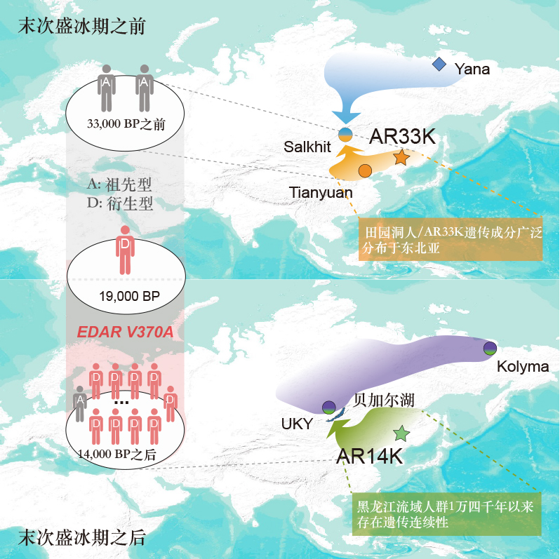 该研究指出生活在末次盛冰期前、距今约3.3万年的AR33K个体与距今4万年田园洞人的遗传成分相似。这表明在末次盛冰期之前,田园洞人相关人群在东亚北部广泛存在(图二)。