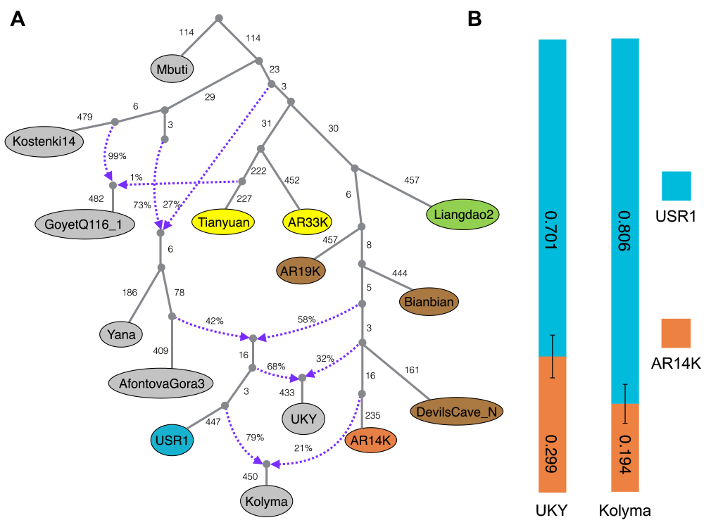 图三. qpGraph(A)和qpAdm(B)人群混合结构模型