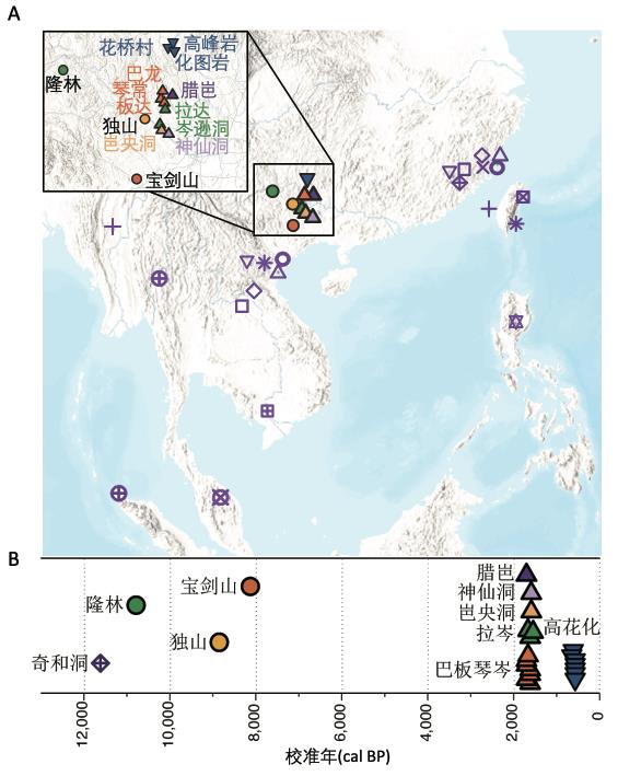 此前,对东南亚和中国南方古人类的基因组研究显示,两地早期人群有着截然不同的遗传历史。在东南亚,距今约12,000-4,000年前的狩猎采集者——和平人(Hòabìnhian, 是一支古老的亚洲人群,与东亚现在生活的人群分离较早。然而自距今4,000年以来,在农业传播的背景下,东南亚地区的农业人群呈现出与现代东亚人群更为相似的遗传结构,他们的基因组中混合了大量中国南方现代人群相关的遗传成分和少量 和平文化相关的古老亚洲人群成分。并且,自距今4,000年以来的东南亚大陆人群的基因组中,中国南方人群为代表的遗传成分占据主导。另一方面,在中国南方福建及周边地区生活着距今9,000-8,000年的以奇和洞人群为代表的古南方人群。他们的遗传关系显示与现在生活的南方人群更相近,与今天的南岛语族人群密切相关。这些研究揭示了东亚南方与东南亚两地早期人群遗传历史的差异性与相关性,也留下许多亟待探索的重要科学问题,为了进一步解答两地人群互动、迁徙等重要科学问题,对位于两地交汇处之一——我国广西地区的人群开展相关古基因组研究成为关键。