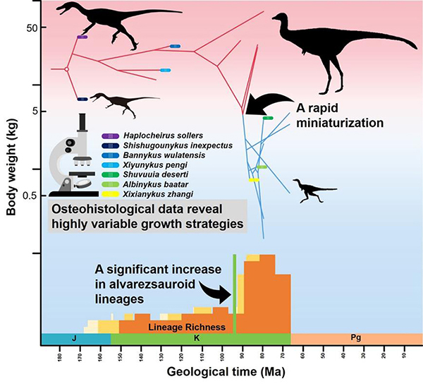 进入白垩纪,随着以显花植物的出现为代表的白垩纪陆地革命的发生,生态环境发生巨变,相当多的兽脚类恐龙在这场“军备竞赛”当中,走上了大型化,甚至巨型化的道路,而仅有以鸟类为代表的少数演化支系体型逐渐变小。如果仅参考已发表的阿尔瓦雷斯龙类化石标本,从晚侏罗世到晚白垩世早期的成员体型要相对晚白垩末期的成员体型大很多,而后者甚至是体型最小的几类非鸟恐龙。虽然学界之前对阿尔瓦雷斯龙类体型演化过程是一个小型化过程是大致认同的,但对此小型化过程出现的时间,演化的速率以及可能的原因都鲜有了解。甚至一些学者认为也不能排除所谓小体型的阿尔瓦雷斯龙类可能是其他大体型恐龙的幼年个体的情况。