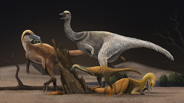 2 四种代表性的阿尔瓦雷斯龙类,Haplocheirus sollers (晚侏罗世,左), Patagonykus puertai (晚白垩世,中上), Linhenykus monodactylus (晚白垩世,中下) Bannykus wulatensis (早白垩世,右下) 的生态复原图,同时展现不同演化阶段阿尔瓦雷斯龙类恐龙体型和食性的差异。(韩志信绘)