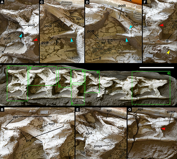 红色(颈椎):中国丝路巨龙;黄色(尾椎):新疆哈密巨龙;绿色(荐椎):未命名化石