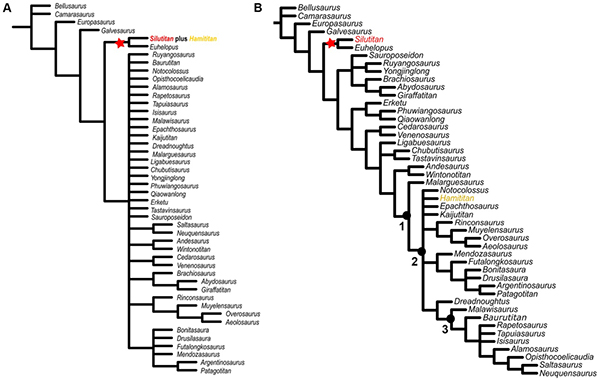 (A) 中国丝路巨龙和新疆哈密巨龙作为单一分类单元;(B)中国丝路巨龙和新疆哈密巨龙作为两个独立的分类单元。1. Titanosauria,2. Colososauria,3.Lithostrotia